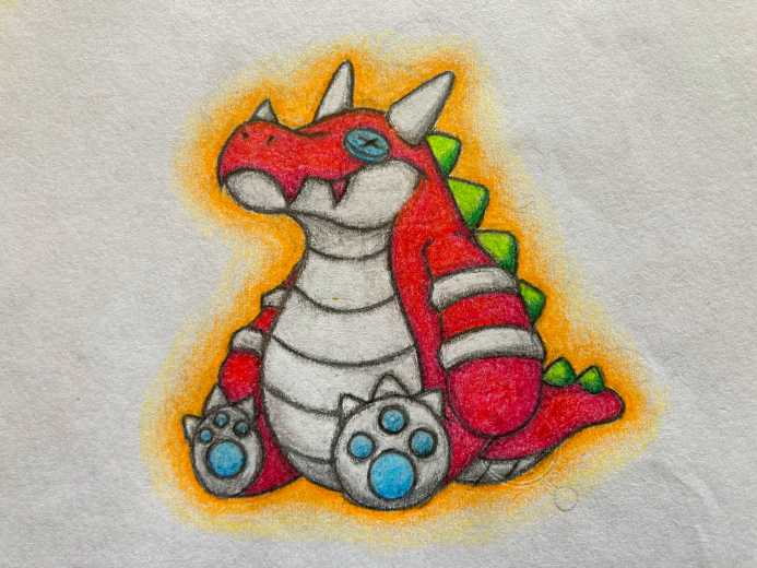 ぬいぐるみのドラゴン。 当初は腹に釘が刺さったクマのぬいぐるみを描こうとしたのが失敗、修正を繰り返している内にいつの間にかドラゴン化。 お気に入りポイントは78点。 没にするか迷いましたが、ギリギリ採用圏内かと思います。 色違いで冥属性の呪われVerとかも面白そう。
