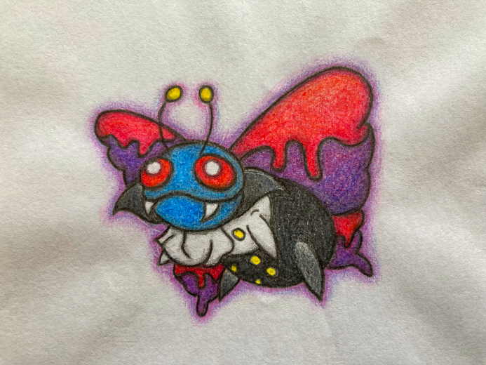 鋭い牙で噛みつき、そこから精気を吸い取る蛾。 お気に入りポイントは96点。 造形色合い共にかなり気に入ってるモンスターです。 散歩してる時に、黒い蝶が川岸で水を吸っているのを見た時に降りてきた思い出深い一体でもあります。