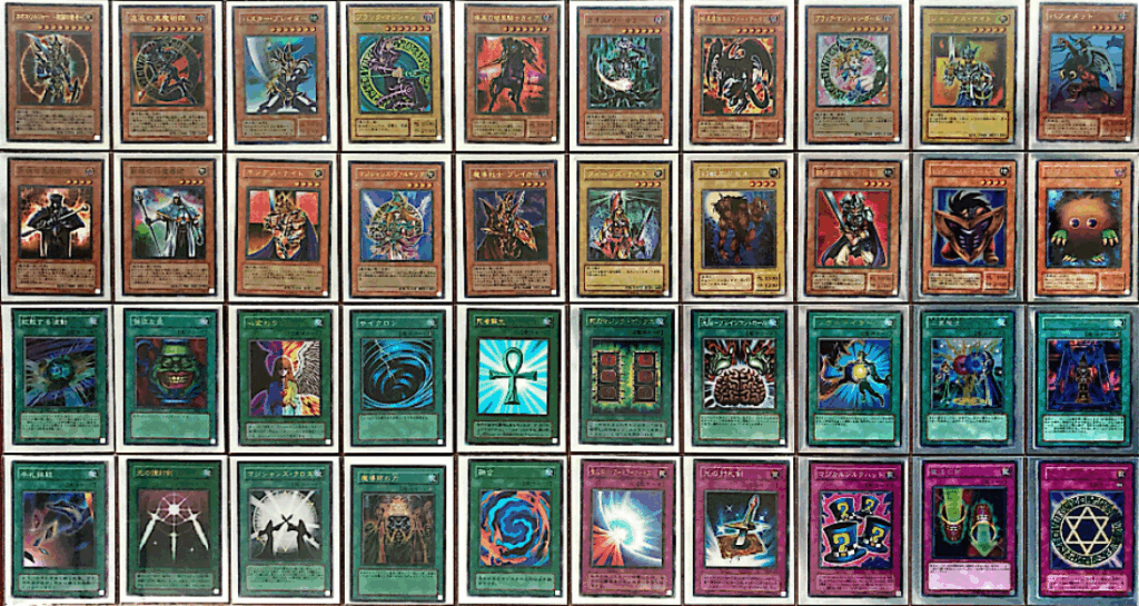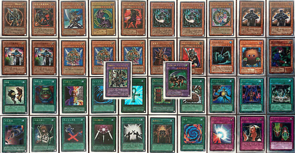 ちなみに上記画像の内、原作&アニメで使用したのは、バスブレ、ブラマジ、ガイア、ギルファーデーモン、マジシャンガール、ジャック、バフォメット、熟練黒、キング、ヴァルキリア、ブレイカー、クィーン、ガゼル、エルフ、ビッグシールド、クリボー、セイマジ、拡散、壺、心変わり、サイクロン、蘇生、マジックボックス、洗脳、ソウルテイカー、二重魔法、ディメンション・マジック、デビルズ・サンクチュアリ、手札抹殺、施し、早埋、護封剣、マジシャンズ・クロス、魔導師の力、融合、ミラフォ、封札剣、シルクハット、筒、六芒星。